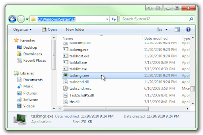 Ini merupakan cara terpanjang untuk membuka Task Manager. Caranya Buka Windows Explorer dan arahkan ke C:\Windows\System32 cari taskmgr.exe lalu double-click